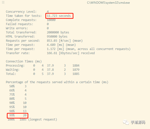 从图片可以看出,10000个请求只用了11s,比之前的130+秒耗时减少了10倍以上。