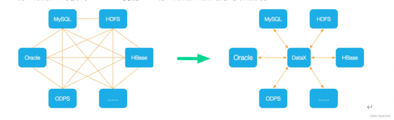 描述:为了解决异构数据源同步问题,DataX将复杂的网状的同步链路变成了星型数据链路,DataX作为中间传输载体负责连接各种数据源。当需要接入一个新的数据源的时候,只需要将此数据源对接到DataX,便能跟已有的数据源做到无缝数据同步。