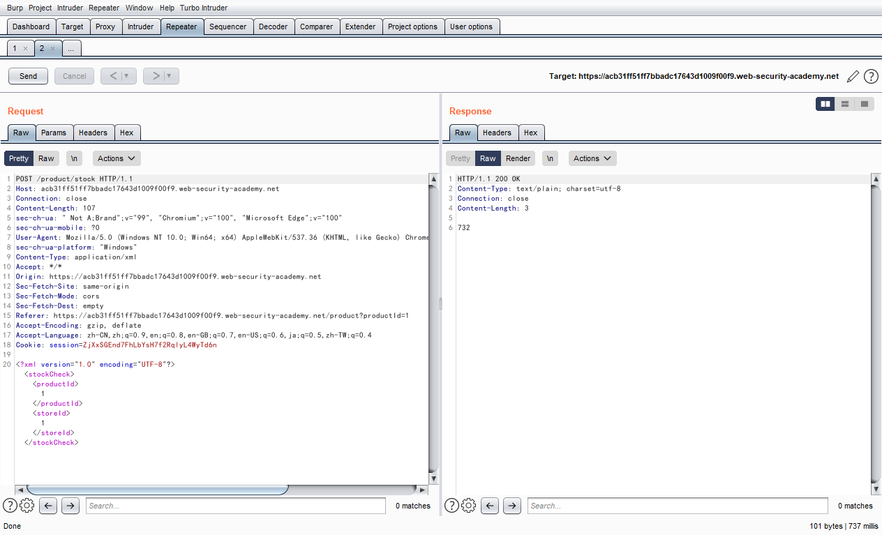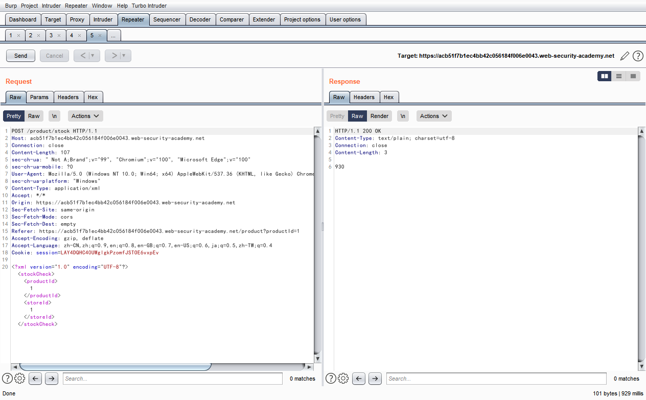 进入靶场之后,先点击任意一个商品 - “view details”,再 Check stock 并抓包。