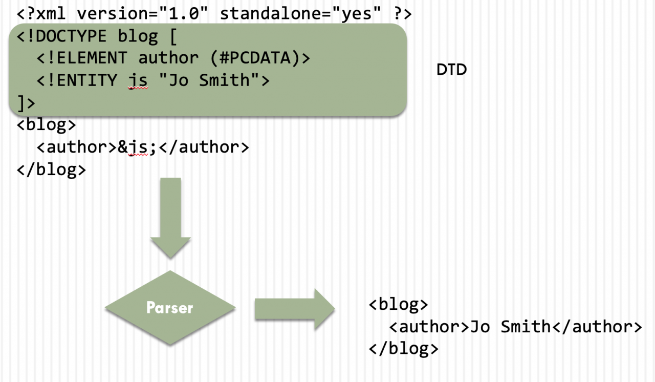 一旦解析器处理了 XML 文档,它将用定义的常量“Jo Smith”替换定义的实体&js