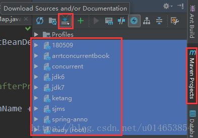 3、对原项目进行重新下载,打开右侧Maven projects,选中所有项目模块之后,点击download sources and/or documentation,即可重新下载依赖jar的源码及文档