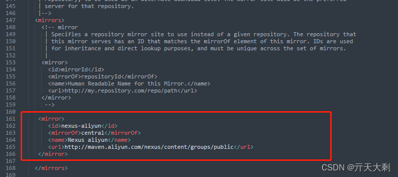 打开安装maven的根目录.然后打开conf文件夹,打开setings.xml文件,查看文件夹中是否有添加中央仓库,我使用的是阿里的中央仓库,如果没有就在<mirrors>标签中间添加:
