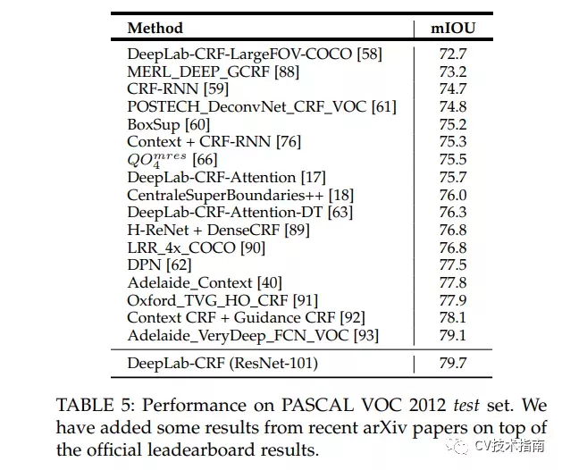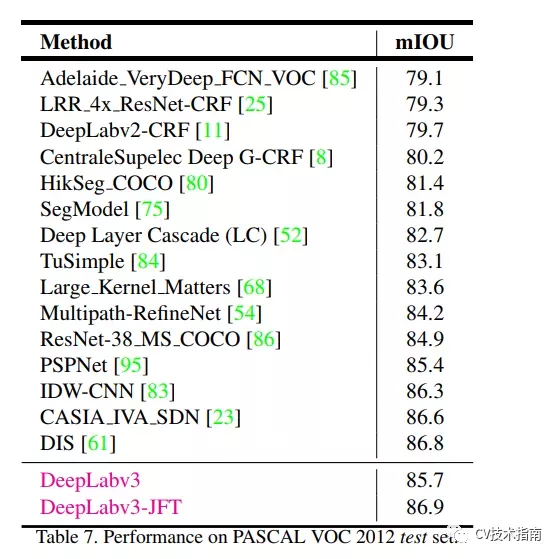 该论文的“DeepLabv3”在没有 DenseCRF 后处理的 PASCAL VOC 2012 测试集上实现了 85.7% 的性能。
