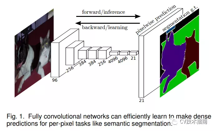 全连接网络获取任意大小的图像并生成相应空间维度的输出。在这个模型中,ILSVRC 分类器被投射到完全连接的网络中,并使用像素级损失和网络内上采样来增强密集预测。然后通过微调完成分割训练。微调是通过在整个网络上的反向传播来完成的。