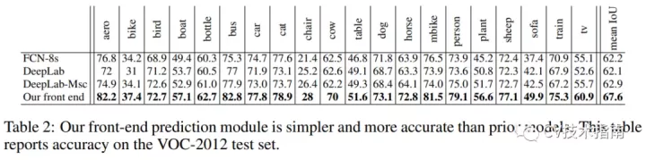 在实验中训练的前端模块在 VOC-2012 验证集上实现了 69.8% 的平均 IoU,在测试集上实现了 71.3% 的平均 IoU。该模型对不同物体的预测精度如下图