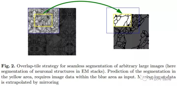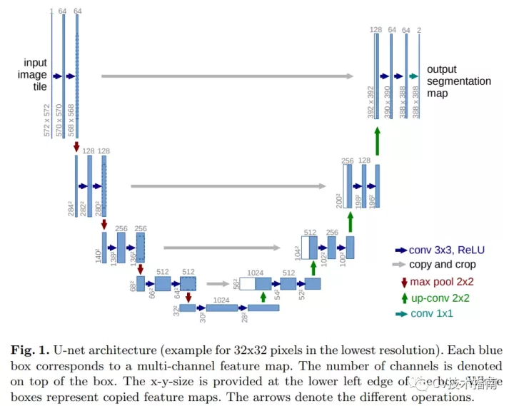 由于可用的训练数据很少,因此该模型通过对可用数据应用弹性变形来使用数据增强。如上图 1 所示,网络架构由左侧的收缩路径和右侧的扩展路径组成。