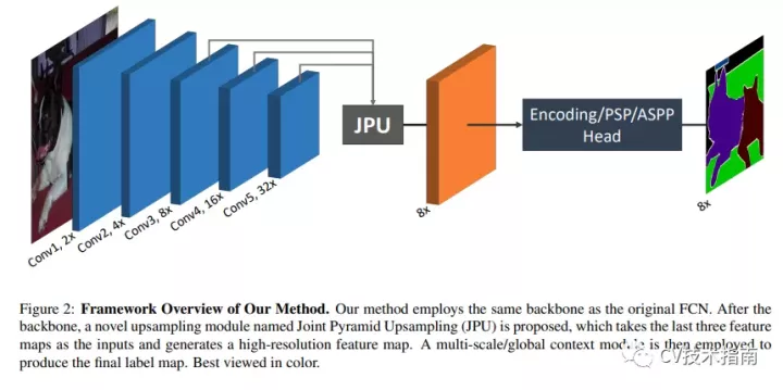 该方法实现了一个全连接网络(FCN)作为主干,同时应用 JPU 对低分辨率的最终特征图进行上采样,从而产生高分辨率的特征图。用 JPU 替换扩张卷积不会导致任何性能损失。
