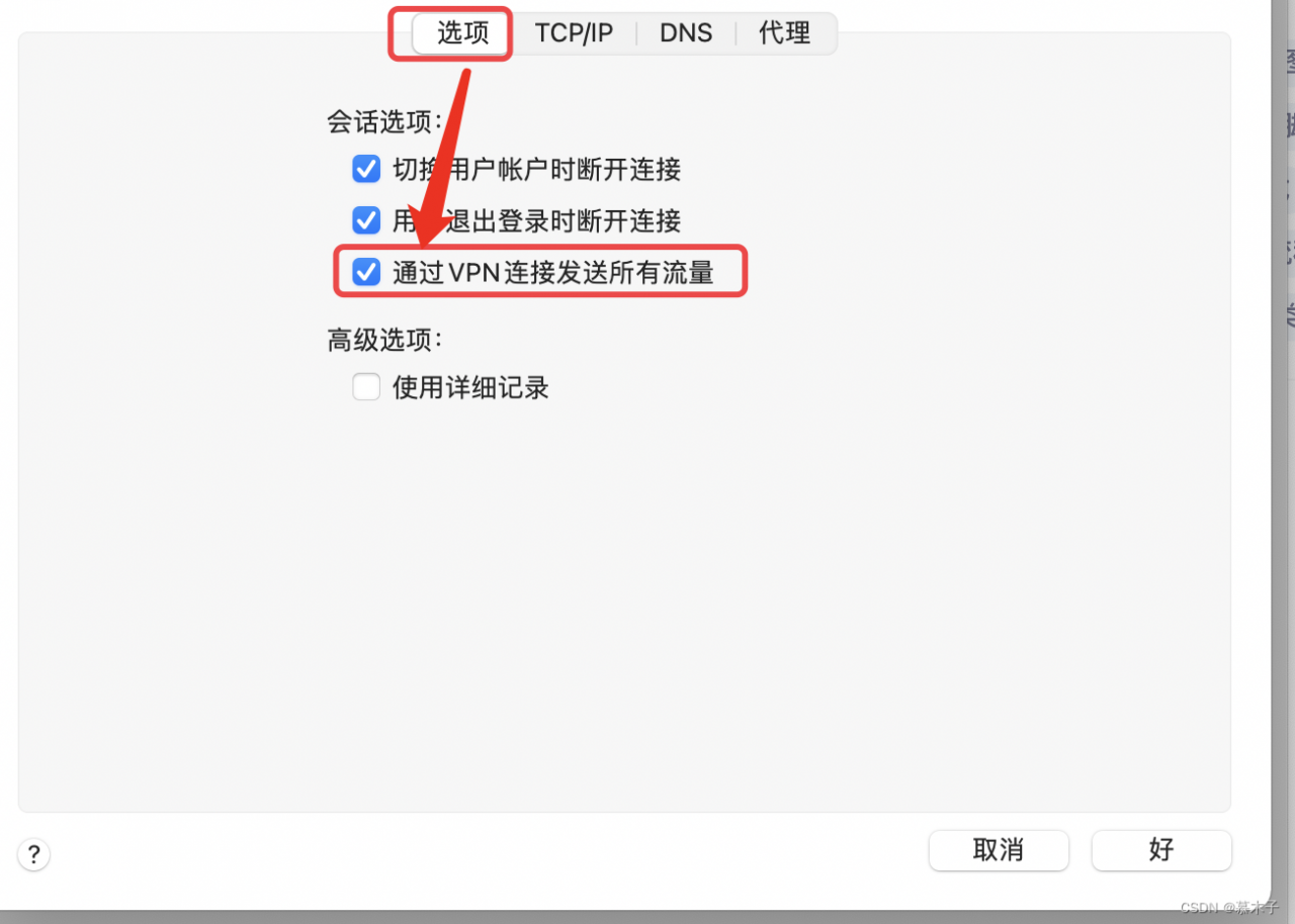 高级选项中,选项配置中选择通过VPN连接发送所有流量