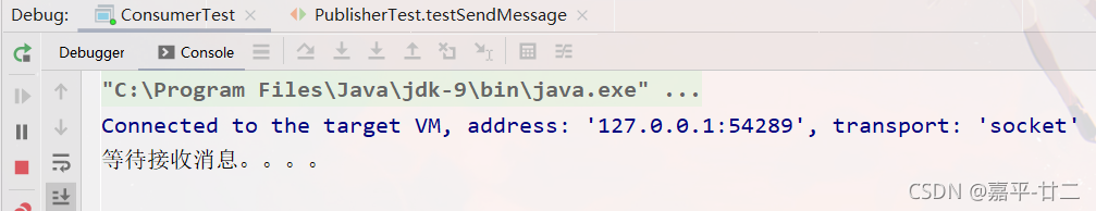 }启动消费者后,客户端队列中显示消费者信息,控制台输出等待接收消息,证明mq连接成功。