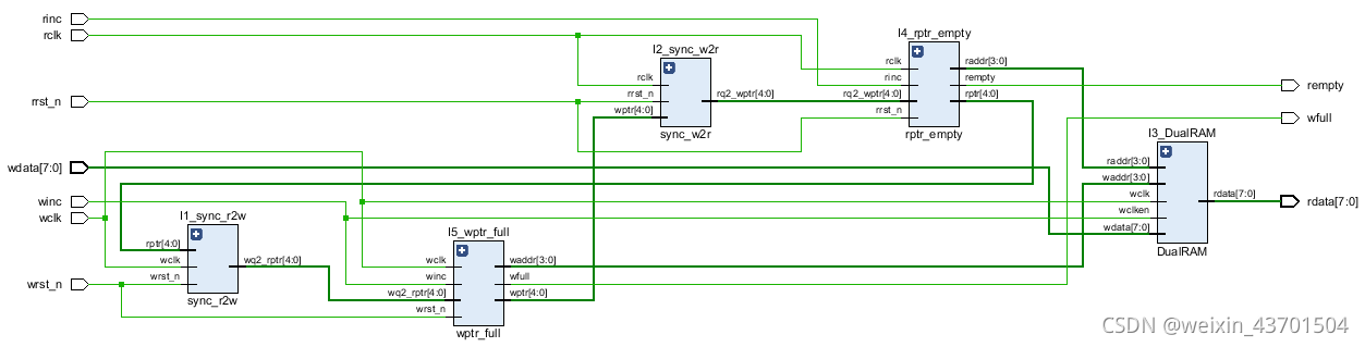 二进制地址对应的格雷码从FIFO判空模块到FIFO判满模块,经过同步模块进行了打一拍的延迟完成时钟的同步。判满模块到判空模块同理。