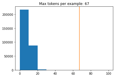 plt.title(f'Max tokens per example: {max_length}');从结果中可以看到训练集的句子转换为token后最多包含67个token: