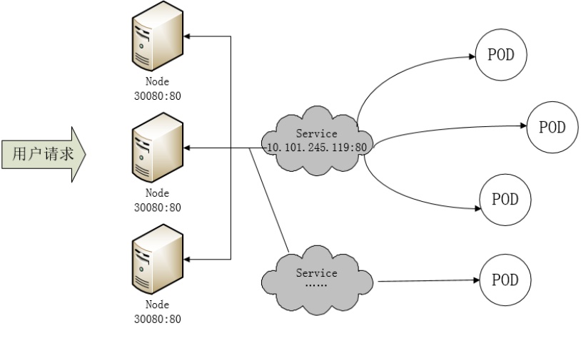 Kubernetes 具有强大的副本控制能力,能保证在任意副本(Pod)挂掉时自动从其他机器启动一个新的,还可以动态扩容等,通俗地说,这个 Pod 可能在任何时刻出现在任何节点上,也可能在任何时刻死在任何节点上;那么自然随着 Pod 的创建和销毁,Pod IP 肯定会动态变化;那么如何把这个动态的 Pod IP 暴露出去?这里借助于 Kubernetes 的 Service 机制,Service 可以以标签的形式选定一组带有指定标签的 Pod,并监控和自动负载他们的 Pod IP,那么我们向外暴露只暴露 Service IP 就行了;这就是 NodePort 模式:即在每个节点上开起一个端口,然后转发到内部 Pod IP 上,如下图所示:此时的访问方式:http://nodeip:nodeport/