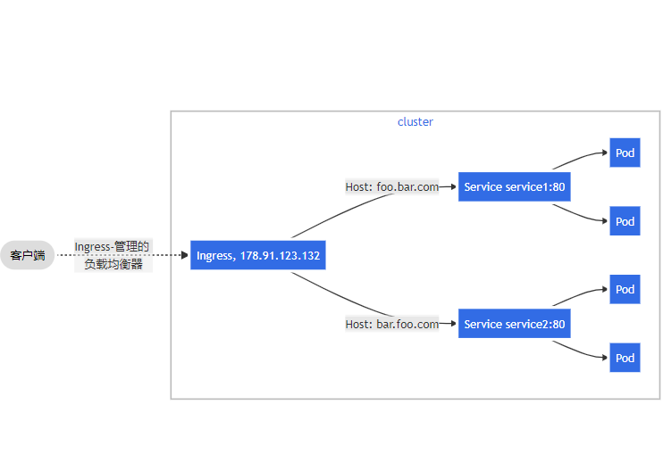 host。在此示例中,未指定host,因此该规则适用于通过指定 IP 地址的所有入站 HTTP 通信。 如果提供了host(例如 foo.bar.com),则rules适用于该host。- 路径列表 paths(例如,