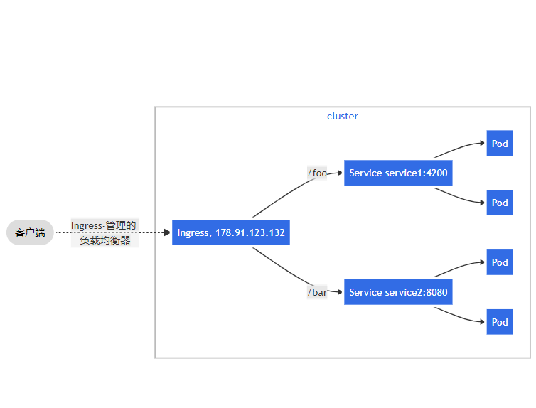 扇出(fanout)官网给的说法,说白了就是根据路径去访问不同的地址。一个扇出(fanout)配置根据请求的 HTTP URI 将来自同一 IP 地址的流量路由到多个 Service。 Ingress 允许你将负载均衡器的数量降至最低。