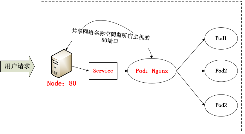 采用 NodePort 方式暴露服务面临问题是,服务一旦多起来,NodePort 在每个节点上开启的端口会及其庞大,而且难以维护;这时,我们可以能否使用一个Nginx直接对内进行转发呢?众所周知的是,Pod与Pod之间是可以互相通信的,而Pod是可以共享宿主机的网络名称空间的,也就是说当在共享网络名称空间时,Pod上所监听的就是Node上的端口。那么这又该如何实现呢?简单的实现就是使用 DaemonSet 在每个 Node 上监听 80,然后写好规则,因为 Nginx 外面绑定了宿主机 80 端口(就像 NodePort),本身又在集群内,那么向后直接转发到相应Service IP就行了 。如下图所示: