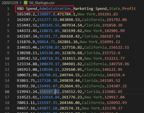 pip install scikit-learn本篇文章使用的50_Startups.csv文件,由研发开销、管理开销、市场开销、州和利润五列数据组成。