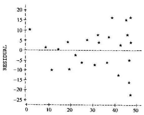 如何判断数据是否满足方差齐性呢?精确的判断是很难做到的,我们可以通过上图绘制X值与残差的关系来大致估计,也可以用一个巧妙的方法:对残差做简单线性回归,如果得到的直线大致平行于X轴,则说明满足方差齐性。