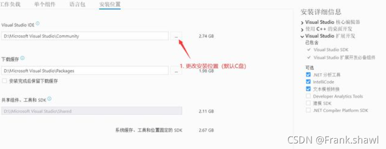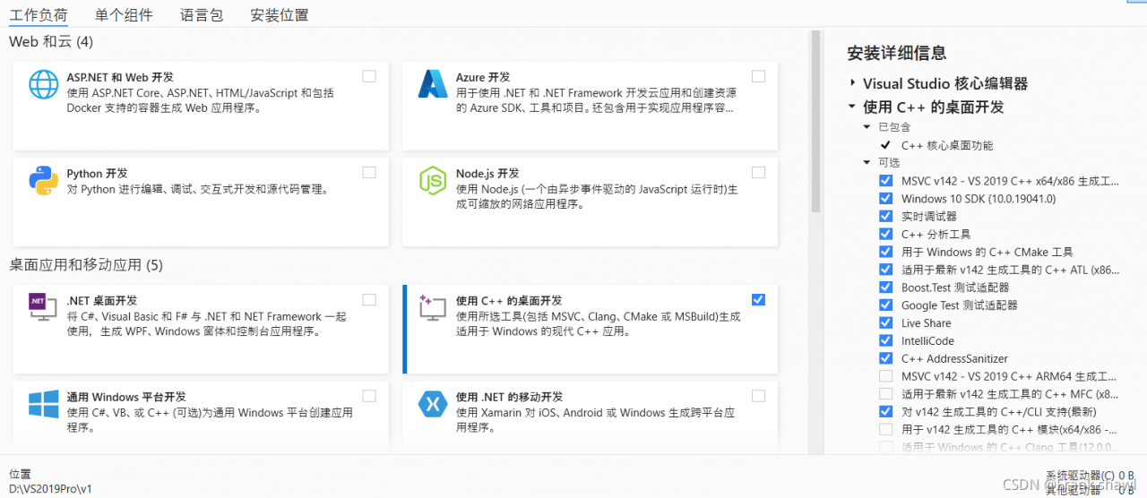 2.其他的可以选也可以不选,根据自己需求,但必须选c++桌面开发和对v142生成工具的c++(支持)最新