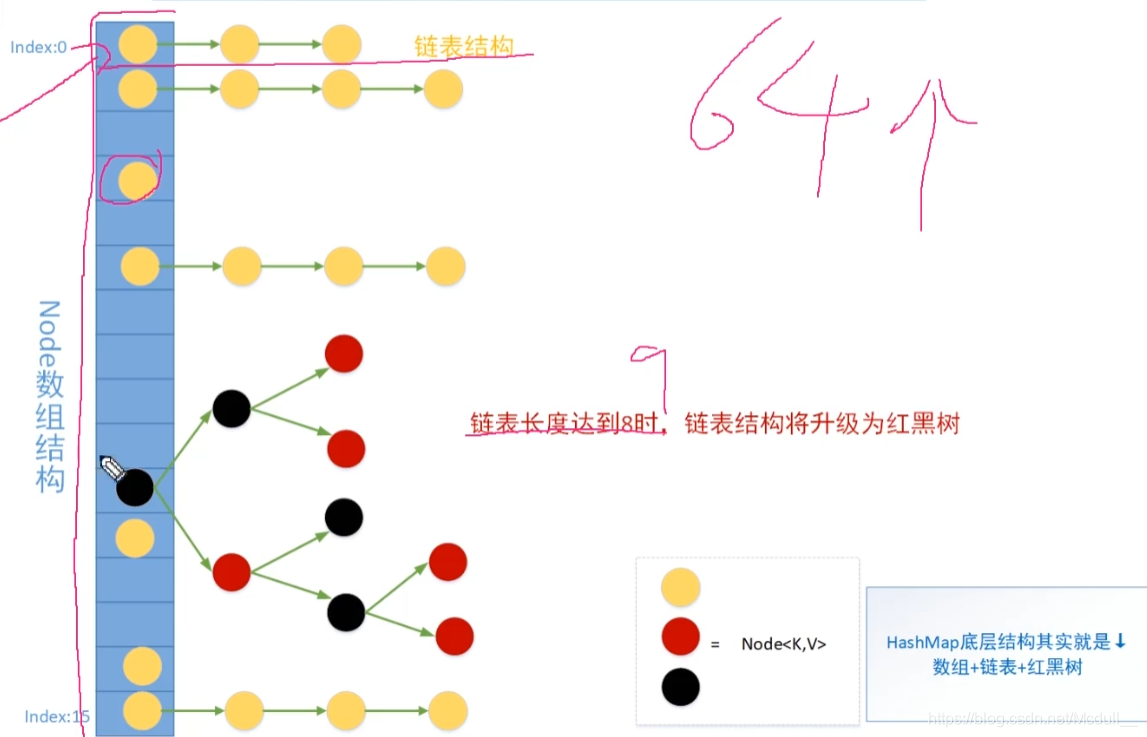 - 这样做的目的是因为,当桶位数(数组长度)比较小时,应尽量避开红黑树结构,这种情况下变为红黑树结构,反而会降低效率。因为红黑树需要逬行左旋,右旋,变色这些操作来保持平衡。同时数组长度小于64时,搜索时间相对要快些。所以结上所述为了提高性能和减少搜索时间,底层阈值大于8并且数组长度大于64时,链表才转换为红黑树,