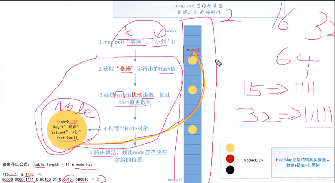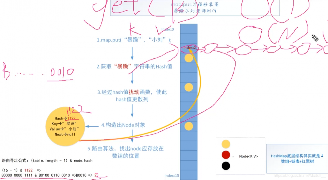 hash碰撞:当计算出来的hash值重复时或者计算出来的值转换成二进制的后四位也是“0010”(以上面例子为例),会导致路由找出来的地址重复,这样就将其放到链表中!