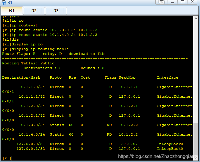 [r1]ip route-static 0.0.0.0 0 10.1.2.2