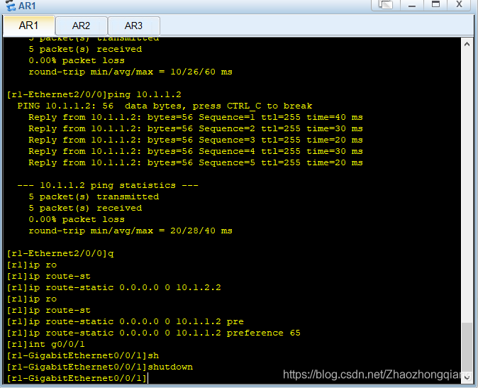 [r1]ip route-static 0.0.0.0 0 10.1.1.2 preference 65