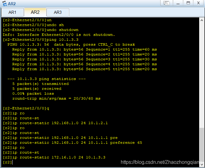 [r2]ip route-static 192.168.1.0 24 10.1.1.1 pre