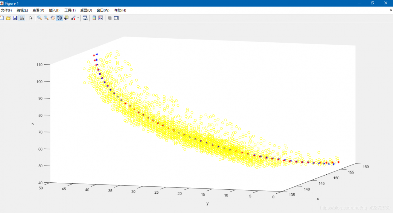 plot3(x_out_f,y,z_out,'b*'); hold on;fb是从外部读进来的数据,我读的是点云数据,x y z 各个坐标的数据,plot3绘制三维数据的图像。