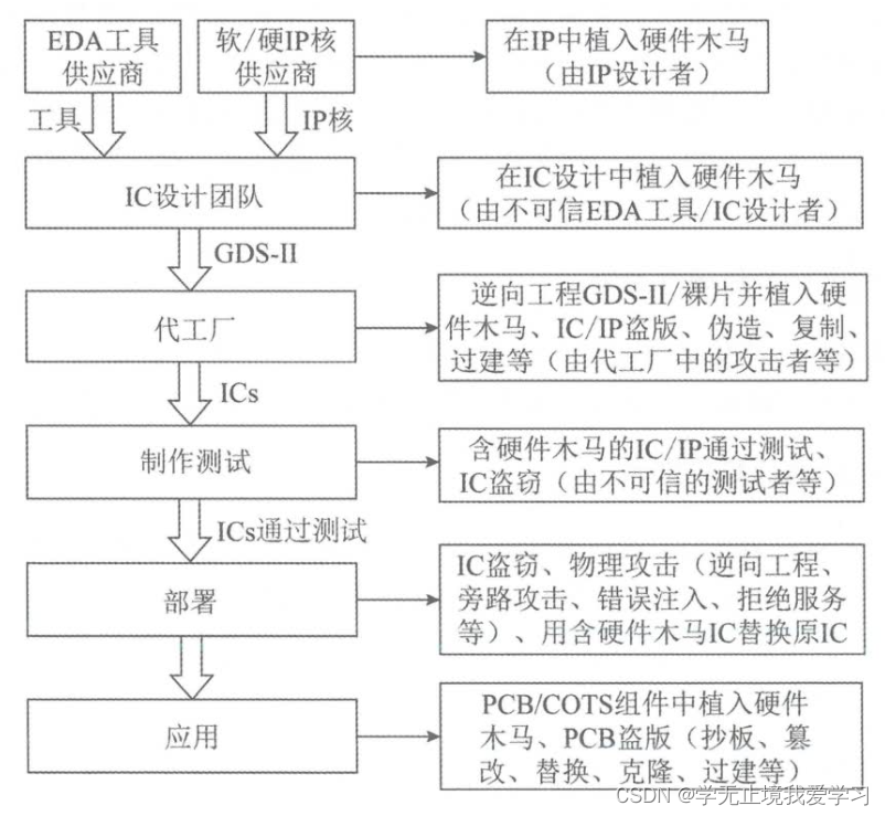 生成阶段:IC整个生命周期内的研发设计、生产制造、封装测试以及应用都有可能被植入恶意硬件逻辑,形成硬件木马