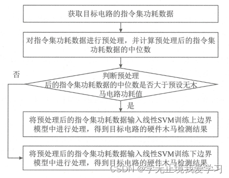 - 侧信道分析法:通过比对电路中的物理特性和旁路信息的不同,发现电路的变化,其技术原理是任何硬件电路的改变都会反映在一些电路参数上,如功率、时序、电磁、热等,其流程如图所示: