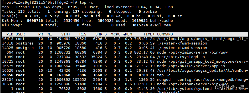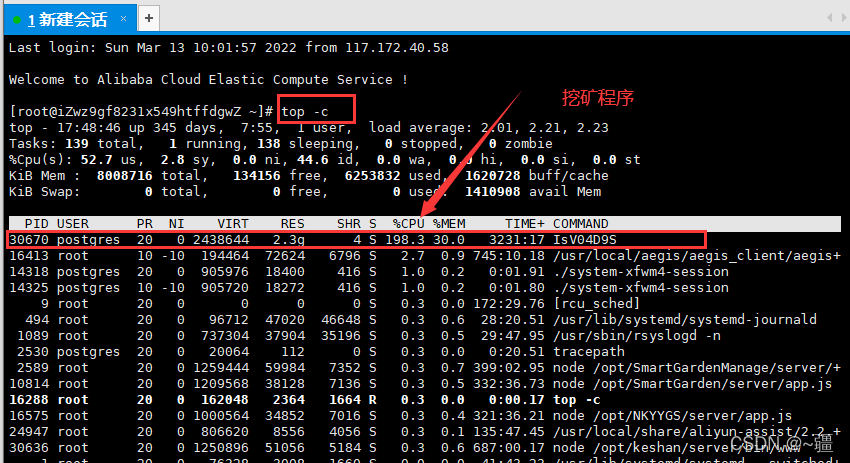 阿里云ESC服务器警告存在挖矿程序查看进程: top -c 可以看到该挖矿程序的pid是30670杀掉该挖矿程序命令:kill pid号。即 kill 30670再次 top -c 查看进程,即可发现没有这个程序了版权声明:本文为qq_40323256原创文章,遵循CC 4.0 BY-SA版权协议,转载请附上原文出处链接和本声明。原文链接:https://blog.csdn.net/qq_40323256/article/details/123760271