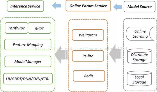 多源支持:对于普通离线学习,模型会导出到文件中,WeiServing通过ModelManager模块管理模型加载,支持本地存储与分布式存储。同时,WeiServing为支持在线机器学习,提供对实时流接口对接,在线训练的模型参数可以实时推送到WeiParam中,为线上提供服务。