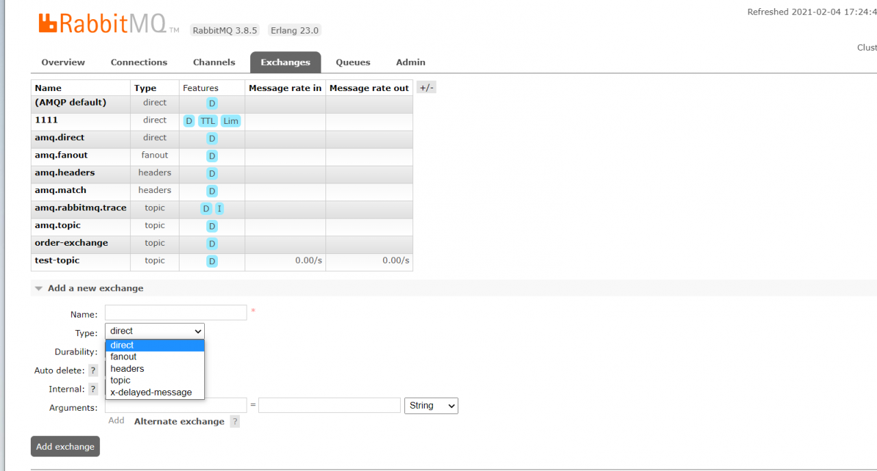 在web页面查看插件是否安装成功:看创建exchanges时type是否有x-delayed-message类型
