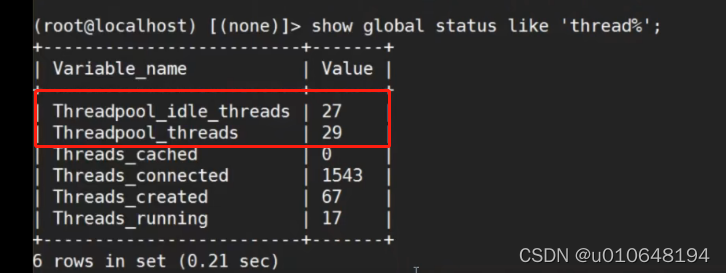 执行 show global status like 'thread%'; 线程线程池的信息;