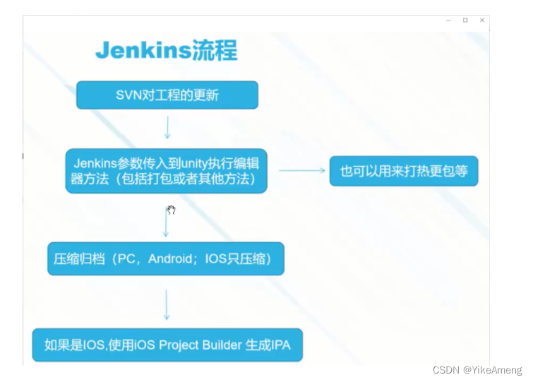 Winrar.exe a -r -ep1 “输出路径.rar” "需要压缩的文件夹路径"比如我的rar在此:开始测试在终端压缩:压缩测试成功:压缩成功了, 但如果是自动化处理,包名就不能写死,因为包名是每次打包时根据时间生成的不同数字。思路:可以在打包时,将包名写入文本文件。打包完后,再读这个文本里的名字,再调用压缩命令。先添加windows批处理命令。增加指令:第一行:进入d盘(因为buildname.txt文件在f盘)第二行:读取 buildname.txt 里的版本号第三行:进入f盘(因为rar软件在f盘)第四行:调用rar软件进行压缩。对应路径:上面有用到之前说到过的, set name=%%i 赋值, %name% 取值这里有个坑,要注意,如果在vs改了代码,不能直接去jinkens执行,要先打开unity,进行编译。报错了:又失败了,调的API的问题,换一下:再打包一次:踩坑! 在修改环境变量后,需要重启jenkins,才能生效。重启的方法:访问此路径,之后点击确认。有个奇怪的问题出现了,我修改的项目的路径WorkPath,但无论怎么打包,都是打的没改之前的那个。配置的E盘:运行的却是D盘:很怪,查一下:但是上面的svn却可以正确引用到:尝试多次,还是不行,再试试加双引号的方式:还是不行:可以看到,无论怎么设置 %WorkPath"都读不到,且前面还会变成 ”工作空间“的路径值。如果不设置”工作空间“,则路径也会变成jinkens的默认路径值。可能是workPath命名被缓存了,或者与系统变量有冲突, 我都改成WorkPath1试下。还是不行。然后看了下参数的说明:原来,他这里的projectpath的p, 要小写。而unity的api中的p,是大写。坑爹!难怪一直读不到 projectPath改好了,再试一下。还是报错了:再重启试一下:还是有问题。又试了几次,也不行。再看下网上别人怎么弄的。发现有个人是用 取 变 量 值 的 。 但 教 程 上 一 直 是 取变量值的。但教程上一直是%xxx%取值的,且教程上是对的。但现在看来教程的版本可能跟我的不同了。于是我也用取变量值的。但教程上一直是取变量。但还是报错了。原来语法要改成这样,只有这样,才不会报错。看下我失败的尝试。新的报错:它说这个类没有。但其实是有的。测试了下,还是不行。上面行了,其实是因为,还是用到了D盘里面的项目了。最后再改了路径,现在是真的用到E盘的正确路径了。踩坑!unity编辑器指令,需要用 $符号,且特定方式取值。它说,此处不应有?是什么意思可能是因为这个文件是在e盘,而之前我是进入的f盘。改成e试下:还是不行:原来这里是必须加分号(? 的, 在教程里,只是用了空格,也通过了。!加好,再试一下!还是不行。在终端测试下,也确实不行。踩坑,再检查一次,发现是这里少了个"in"改好,再试一次:现在报winRar的错误了:改成大写试一下:还是不行, 试一下从终端跑下:可能是要先进f盘, 再cd踩坑,windows终端上,要cd之前,一定要先进入盘符。终于成功了。再看包体,已经自动压缩成rar了。归档:对归档存量的设置,如下:超过30天的将被删除, 最多保留30个,超过后,前面的也将被删除归档成品,选这里:然后在这里设置:它就会在打包完成后,将成品拷贝到目标位置去。到这里,PC打包完成。补充:Unity_Windows平台相关知识:https://docs.unity3d.com/cn/2019.4/Manual/WindowsStandaloneBinaries.html成包的各部分含义说明:如下,是unity文档的说明:IL2CPP:IL2CPP的含义:( Intermediate Language To C++)使用 IL2CPP 构建项目时,Unity 会在创建本机二进制文件之前将脚本和程序集内的 IL 代码转换为 C++