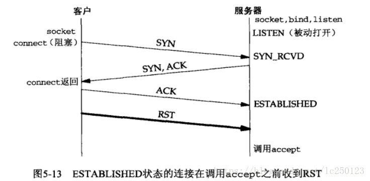 这种情况是:三路握手完成从而连接建立之后,客户 TCP 却发送了一个 RST(复位)。在服务器看来,就在该连接已由 TCP 排队,等着服务器进程调用 accept 的时候 RST 到达。如下: