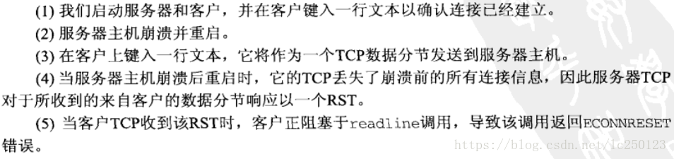 当服务器主机崩溃时,不会对客户的数据分节作出响应,此时客户 TCP 调用 read 所返回的错误是 ETIMEDOUT。然而如果某个中间路由器判定服务器主机已不可达,从而响应以一个 “destination unreachable” 的 ICMP 消息,那么所返回的错误是 EHOSTUNREACH 或 ENETUNREACH。