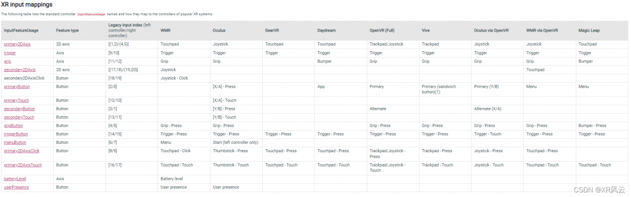 那如何使用呢?我们先看看Unity封装的各个按键的对应关系。已经支持了很多市面上的VR设备。主要还是Oculus。你可以去官网上进行参考:Unity - Manual: Unity XR Input