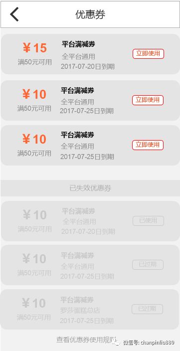 当有一个必填项为空时,“提交”按钮置灰,不可点击。有的时候还限制优惠券使用哪些商品,这里没有体现出来,想更加深入思考的小伙伴可以自行设计一下。