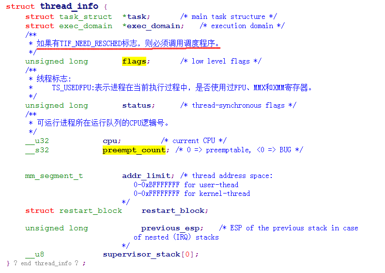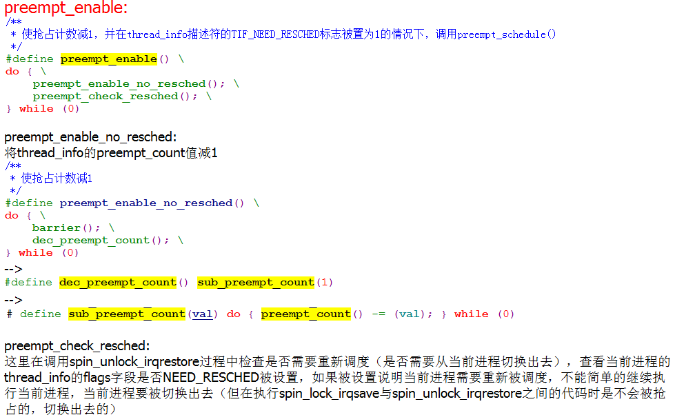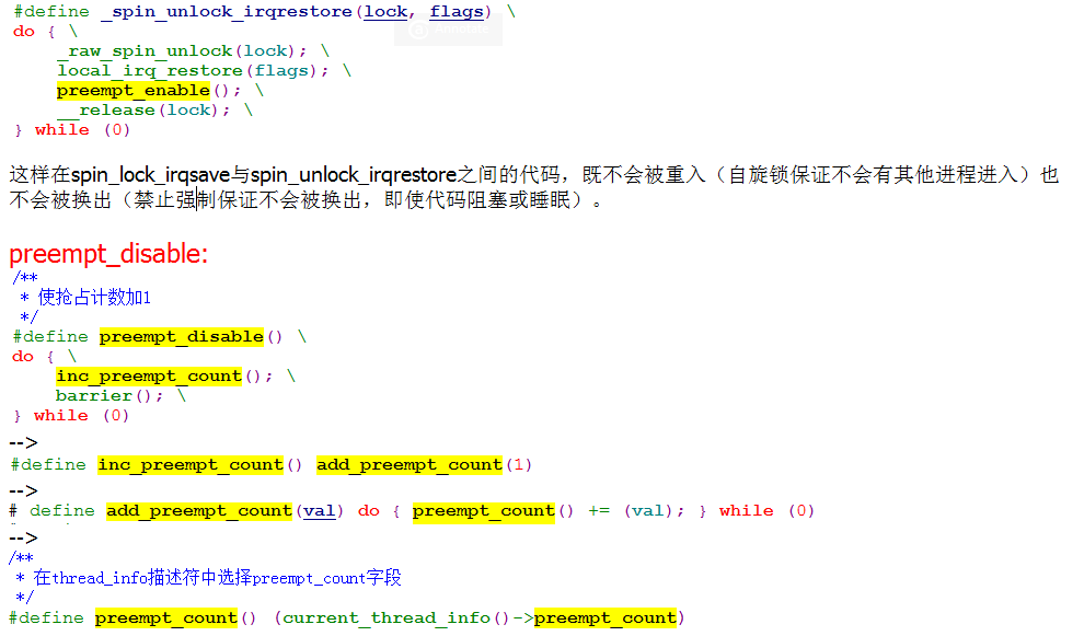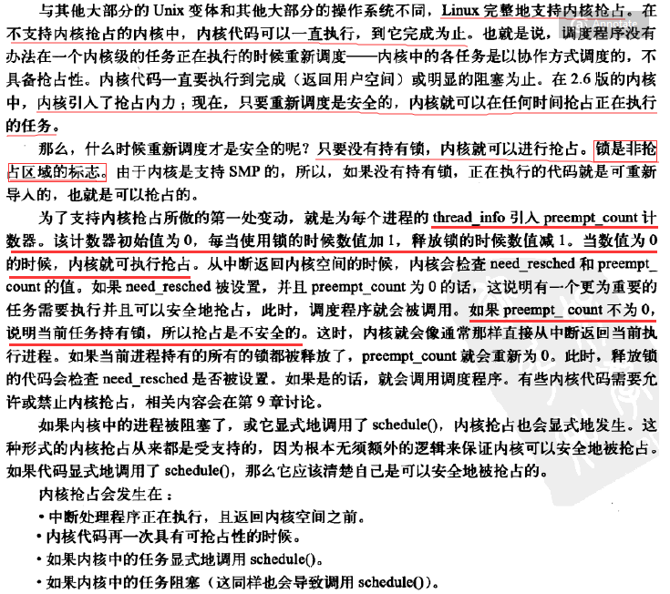 在spin_lock_irqsave与spin_unlock_irqrestore中的内核抢占持有锁不可以抢占,一旦被抢占,锁将会长时间不能释放,在另外一个CPU的进程(如中断)如果也在等待该锁(如自旋锁),将会长时间等待。检查是否需要抢占的时机:1,中断返回内核之前2,在锁释放的时候,因为释放锁时,锁的数值可能为0,这个时候内核就可以抢占,所以在释放锁时检查下是否有抢占(是否有紧急的任务需要执行)版权声明:本文为yiyeguzhou100原创文章,遵循CC 4.0 BY-SA版权协议,转载请附上原文出处链接和本声明。原文链接:https://blog.csdn.net/yiyeguzhou100/article/details/49869015
