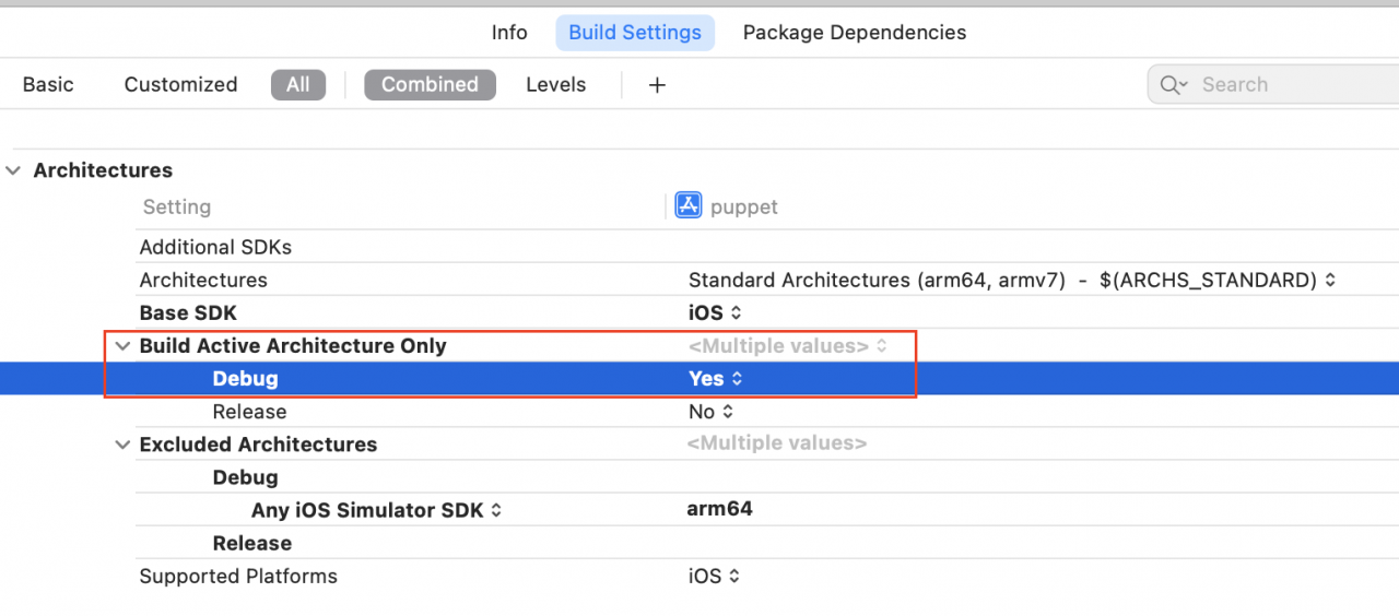 刚才说过,Xcode有可能对所有有效架构进行编译,而如果把Build Active Architecture Only设置为true,就可以仅对当前的架构进行编译,加快速度,同时也能避免对arm64架构的编译。