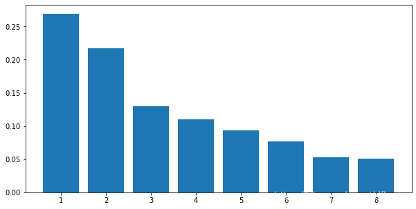 plt.bar([1,2,3,4,5,6,7,8],var_ratio)