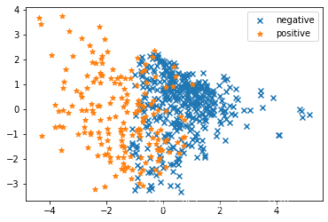 plt.scatter(X_pca[:,0][y==0],X_pca[:,1][y==0],marker='x',label='negative')