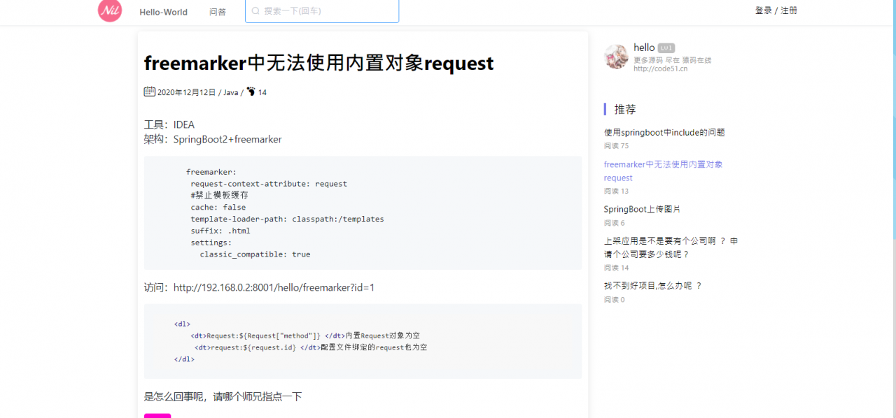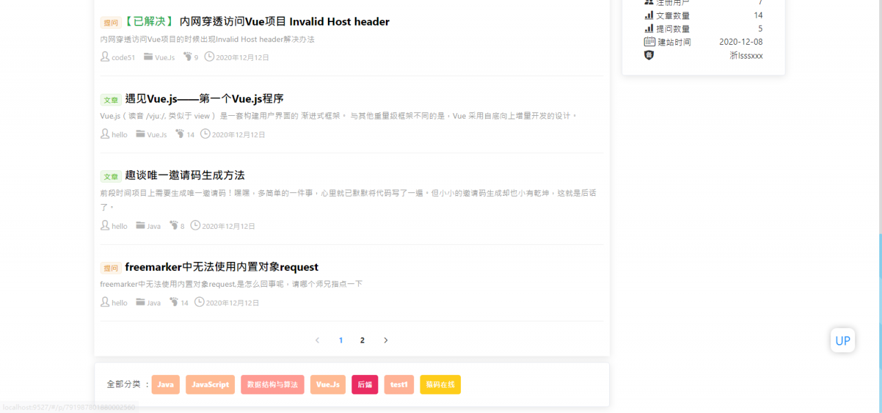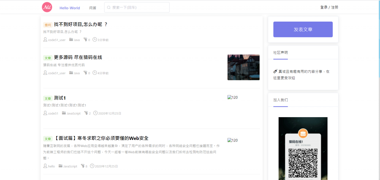 基于SSM+SpringBoot+MySQL+Vue前后端分离的博客论坛系统,整体包含前后端框架,前端包含搜索,发布提问文章,发布文章,用户登陆注册,留言,预览等。后端整体包含文章分类管理,文章列表,用户列表,评论列表,页面配置。