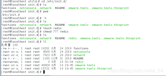 在系统init.d 目录下新建文件redis,授权运行,因为我们稍后把要执行的脚本写入进去。