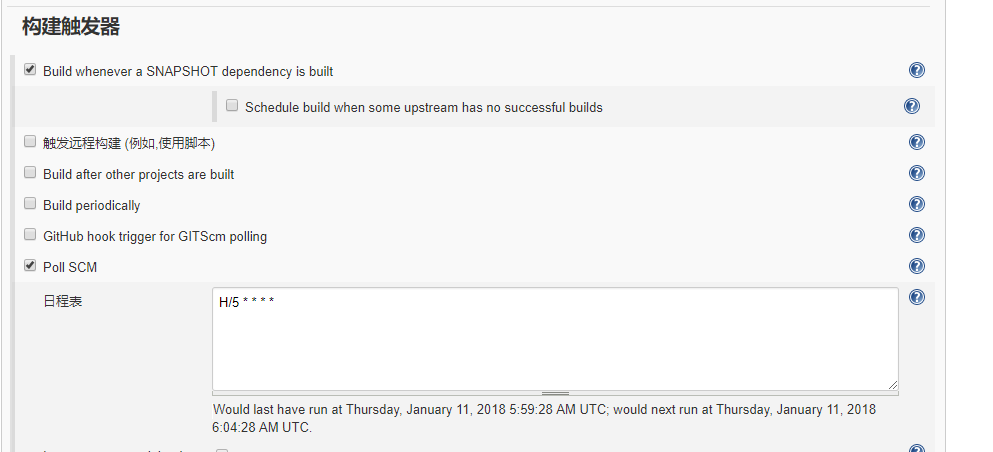 配置自动构建,勾选POLL SCM,配置5分钟检查一次,当svn发生变化时,会自动启动构建