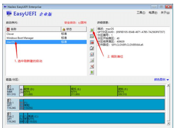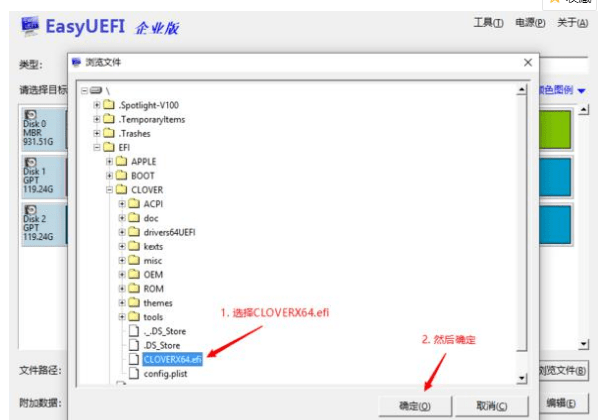 选中刚才复制 CLOVER 文件夹的硬盘 EFI 分区,选择浏览 CLOVER 文件夹下的 CLOVERX64.efi 引导文件。将 CLOVER 启动项进行启动位置进行调整,然后保存退出就可以再启动时不需要 U 盘进行引导进 Mac 系统了。
