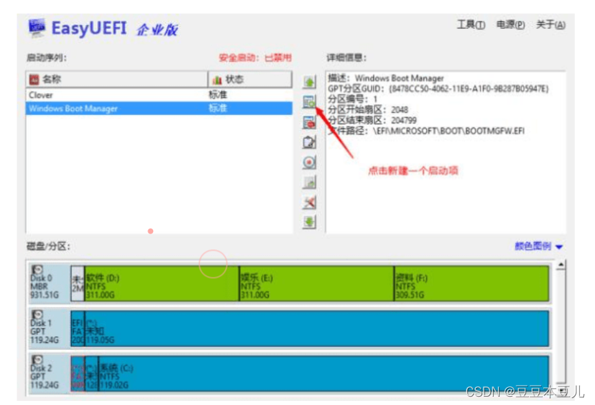 这时需要的工具是 EasyUEFI,在该应用中选择管理 EFI 启动项,在该启动项中可以看到当前电脑默认的 EFI 启动项。