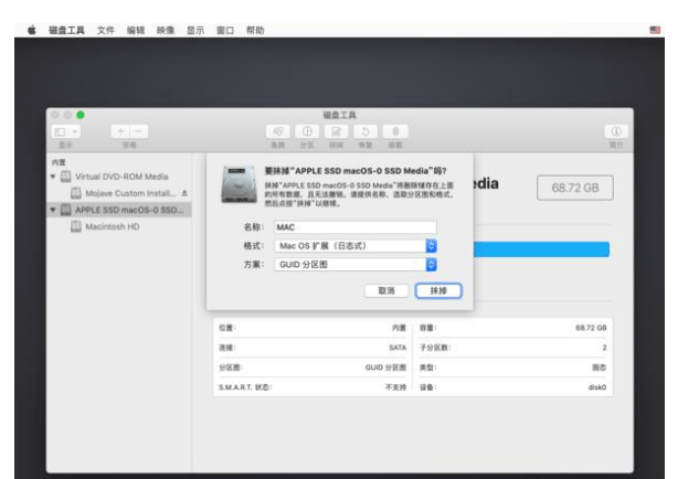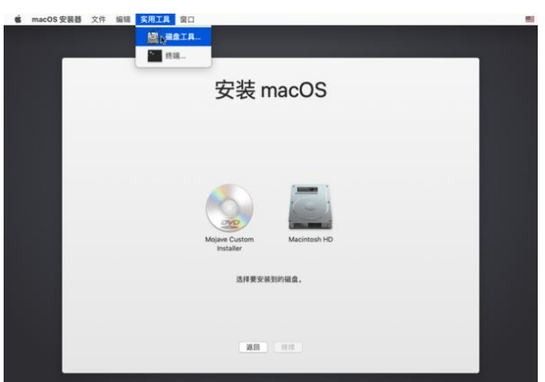 在磁盘这一步时选择菜单栏的 " 磁盘工具 ",找到需安装 Mac 系统的磁盘分区选择格式化,这里选择扩展(日志式)。