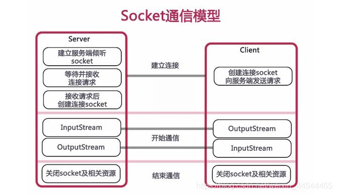 客户端请求与服务器进行连接的时候,根据服务器的域名或者IP地址,加上端口号,打开一个套接字。当服务器接受连接后,服务器和客户端之间的通信就像输入输出流一样进行操作。